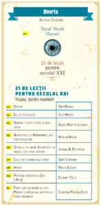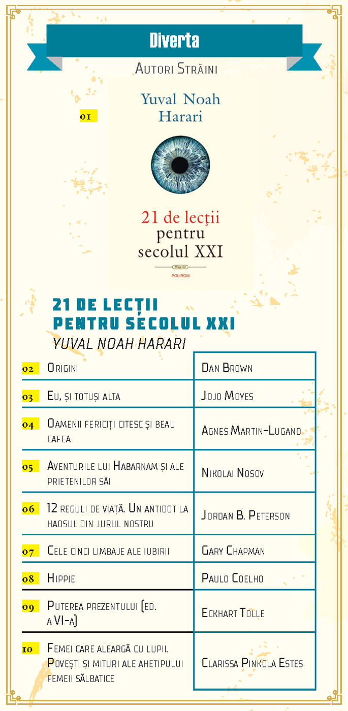 Topul Diverta al autorilor străini este dominat de volumul „21 de lecții pentru secolul XXI”, semnat de Yuval Noah Harari. Acesta este urmat în clasament de romanele „Origini” de Dan Brown și „Eu, și totuși alta” de Jojo Moyes. Autorii străini căutați în librăriile Diverta au fost: Paulo Coelho, Nikolai Nosov, Gary Chapman și Eckhart Tolle.