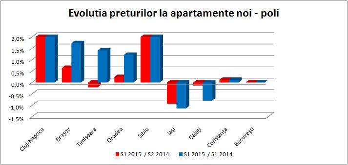 Comparativ cu perioada de început a crizei (anul 2008), preţurile apartamentelor noi au scăzut cu aproximativ 33%. În decursul ultimelor şase luni prețul mediu a înregistrat o ușoară evoluție pozitivă, de aproximativ 0.4%, trendul în ultimele 12 luni fiind unul similar. Astfel, preţul mediu unitar la nivel naţional în semestrul I din 2015 s-a situat la nivelul de 779 €/mp. În general, în ultimele şase luni s-a înregistrat o tendință de creștere a prețurilor, atât la nivelul polilor de dezvoltare, cât și la nivelul orașelor mici.