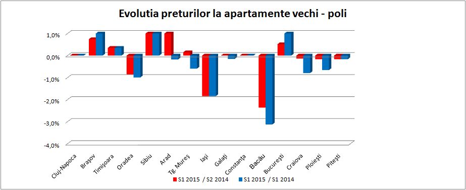 La nivelul principalilor poli de dezvoltare, cea mai mare scădere din semestrul I 2015 comparativ cu semestrul II 2014, a fost înregistrată în Bacău (-2.4%), urmată de Iași (-1.8%) și Oradea (-0.9%). Dintre cei 15 poli principali de dezvoltare, şase oraşe au înregistrat mici evoluții negative, trei oraşe au prețuri în stagnare, iar şase orașe (printre care și Capitala) au înregistrat mici creșteri de preţ.