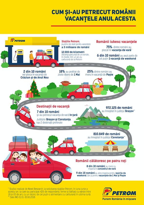 Românilor le plac vacanțele, iar cea de vară rămâne cel mai important concediu al anului: 75% dintre participanții la studiu au profitat de vacanța de vară, anul acesta. 75.9% dintre românii care au alimentat în stațiile Petrom au mers în vacanță, în sezonul cald, fie singuri, fie cu familia sau cu prietenii, arată un studiu național realizat la solicitarea stațiilor Petrom, în luna iunie a acestui an. La cercetare au participat 426 de respondenți, femei și bărbați cu vârste între 18 și 65 de ani, cu un istoric de cel puțin o alimentare cu carburanți în ultima lună.