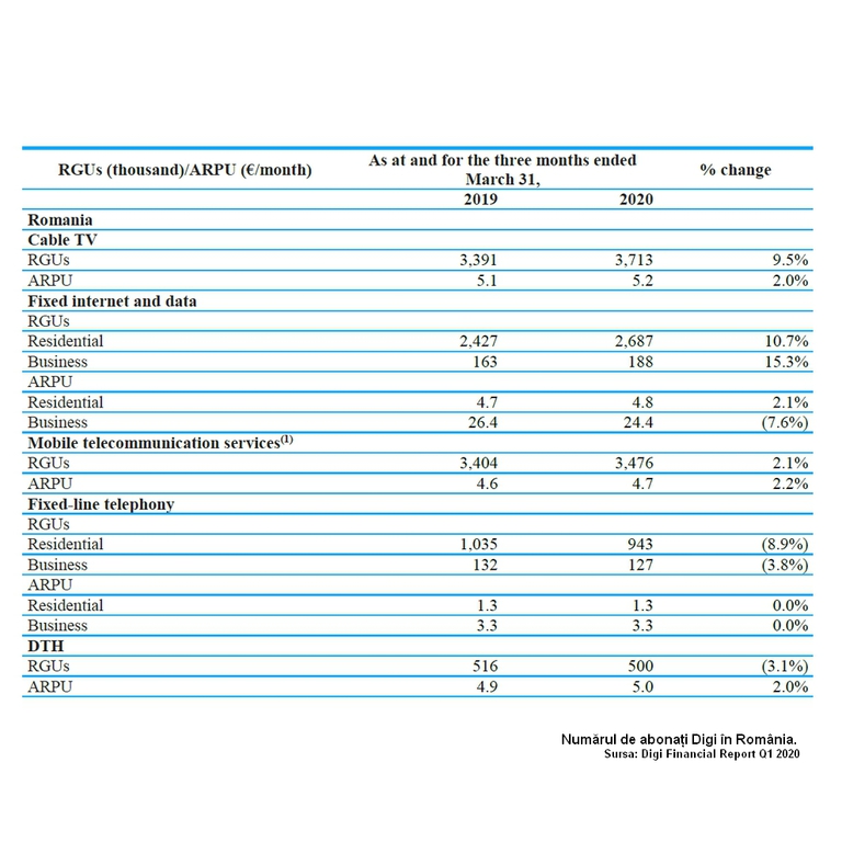 Abonații la cablu TV au crescut de la aproximativ 3.391.000 la 31 martie 2019 la aproximativ 3.713.000 la 31 martie 2020, o creștere de aproximativ 9,5% (inclusiv prin transferul abonaților din mai multe rețele cum sunt Canal S, Akta în 2019 și Expertnet din Oltenița în martie 2020 – n.red. Media Expres), iar internetul fix rezidențial a crescut de la 2.427.000 de clienți la 31 martie 2019 la aproximativ 2.687.000 la 31 martie 2020, o creștere de aproximativ 10,7%.