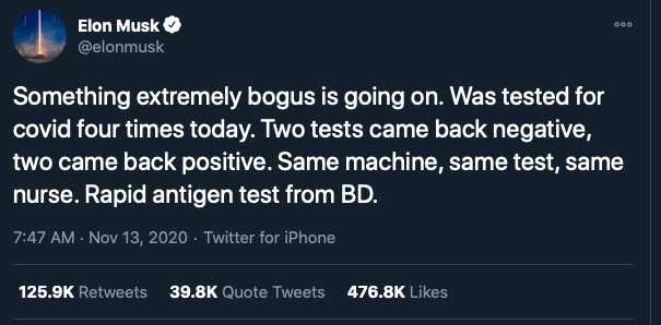 Musk a declarat joi că rezultatele testelor rapide au arătat pozitiv de două ori și apoi negativ de două ori, în aceeași zi.