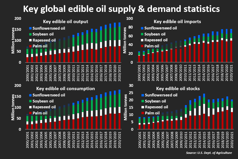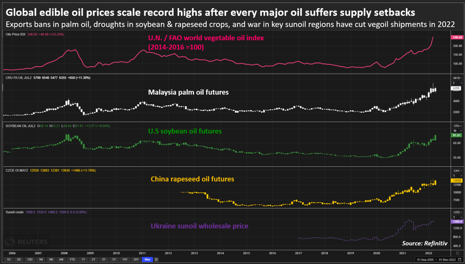 “O astfel de situație se poate întâmpla oricând, iar exportul tuturor celorlalte tipuri principale de ulei este pus sub o mare presiune: uleiul de soia este afectat din cauza secetei din America de Sud; uleiul de rapiță din cauza recoltelor dezastruoase din Canada; iar uleiul de floarea soarelui din cauza războiului Rusia-Ucraina,” a spus Fry.