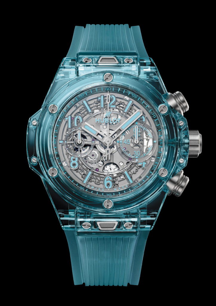 2025 este anul în care Hublot sărbătorește 20 de ani de la lansarea liniei Big Bang. Și bineînțeles că, pentru acest moment aniversar, brandul elvețian aduce în atenția publicului o serie de ceasuri ce întruchipează spiritul Big Bang, printre care se numără și setul Hublot Big Bang 20th Anniversary „Materials and High Complications”. Aceste noi creații continuă să surprindă, fiind „născute” pe același teritoriu al inovației, al materialelor inedite, al experimentului și al unei viziuni cu adevărat avangardiste. Transparență, contrast și culoare – sunt trăsăturile definitorii ce caracterizează cele cinci piese unicat din acest set: Big Bang Tourbillon Automatic Sapphire, Big Bang Tourbillon Chronograph in Water Blue Sapphire, Big Bang Tourbillon Automatic Red Magic, Big Bang Tourbillon Chronograph Cathedral Minute Repeater și Big Bang Integrated Tourbillon Cathedral Minute Repeater. Toate modelele Big Bang lansate în acest an la Geneva surprind esența Big Bang prin abordare, prin construcție și prin elementele de design. Piesa Big Bang Unico Water Blue Sapphire – un model în ediție limitată de 50 de exemplare – atrage atenția prin structura sa și prin nuanța sa tropicală ce face trimitere chiar la sursa de inspirație. Carcasa cu diametrul de 44 mm găzduiește un mecanism cronograf cu funcție flyback, cu încărcare automată, ce completează latura estetică prin această complexitate de ordin tehnic. Big Bang One Click Joyful este o serie de cinci ceasuri dedicate doamnelor, fiecare model fiind realizat într-o cromatică specifică și împodobit cu un anumit tip de pietre prețioase. Ultimele, dar – bineînțeles – nu cele din urmă sunt modelele Big Bang Unico Petrol Blue și Mint Green, acesta din urmă aducând o nuanță nouă în paleta cromatică explorată de Hublot de-a lungul anilor.