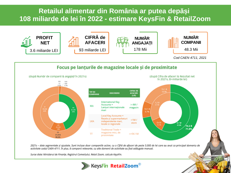 Pentru 2022 analiștii KeysFin & RetailZoom estimează apropierea de pragul de 108 miliarde de lei pe fondul avansului consumului, dar mai ales al accentuării presiunilor inflaționiste.