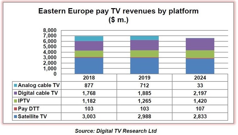 Europa de Est se îndreaptă cu pași hotărâți spre renunțarea la cablul TV analogic, care număra încă 17,67 milioane de abonați la finalul anului trecut, din care vor mai rămâne doar 568.000 până în anul 2024. Numărul abonaților la cablul TV digital va crește însă cu doar 13 milioane între 2018 și 2024, până la 78 de milioane.