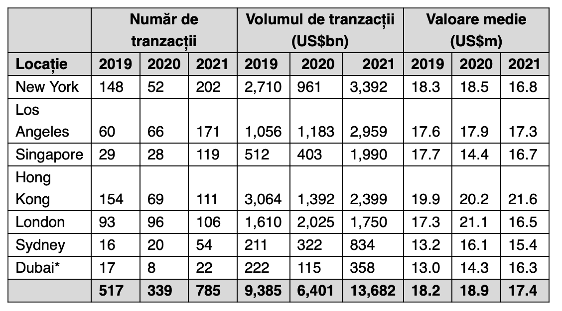 Ultimul loc este ocupat de Dubai, cu 22 de tranzacții, de la 8 în primele șase luni din 2020 și un volum de tranzacții 358 milioane de dolari.