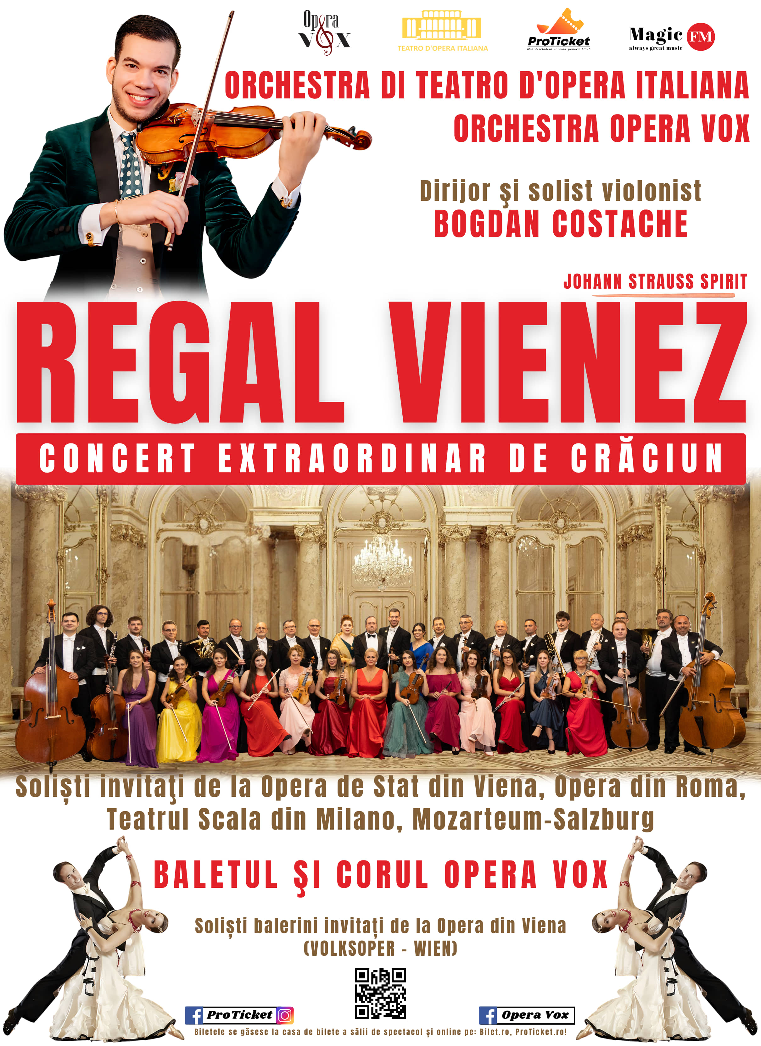Soliști invitați de la Opera de Stat din Viena, Opera din Roma, Scala din Milano, Mozarteum-Salzburg și două orchestre celebre Orchestra di Teatro D’opera Italiana și Orchestra Operei Vox, concertul extraordinar de Crăciun Regal Vienez vă aduce pe scenă cele mai frumoase capodopere muzicale vieneze ale dinastiei Strauss, Franz Lehar, Emmerich Kalman și multe, multe alte surprize muzicale și coregrafice.