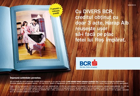 După Făt Frumos şi Greuceanu, folosiți în platforma de comunicare pentru BCR, a venit rândul lui Harap Alb să-şi ducă planurile la bun sfârşit. Povestea scrisă de Next Advertising sună astfel: eroul zilelor noastre are nevoie de bani pentru a-i îndeplini dorinţele domniţei sale, Fata lui Roş Împărat. Lăsat baltă de bunica ochelaristă Ochilă şi de prietenul său Setilă, Harap Alb îşi îndeplineşte misiunea cu ajutorul creditului „Divers BCR”, obţinut cu numai trei acte.
