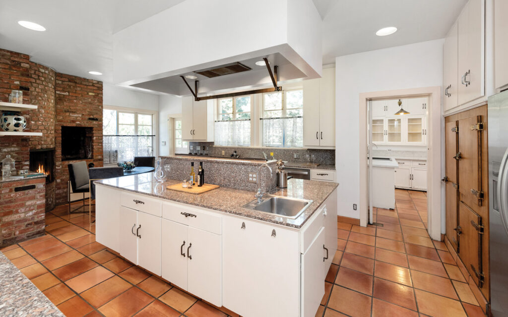 Bucătăria se înscrie în aceeași notă generoasă, atât ca spațiu, cât și ca dotări – cel mai pretențios chef s-ar simți aici ca acasă. Elementul de efect al bucătăriei este însă șemineul, a cărui ramă din cărămidă se întinde de la podea până la tavan.