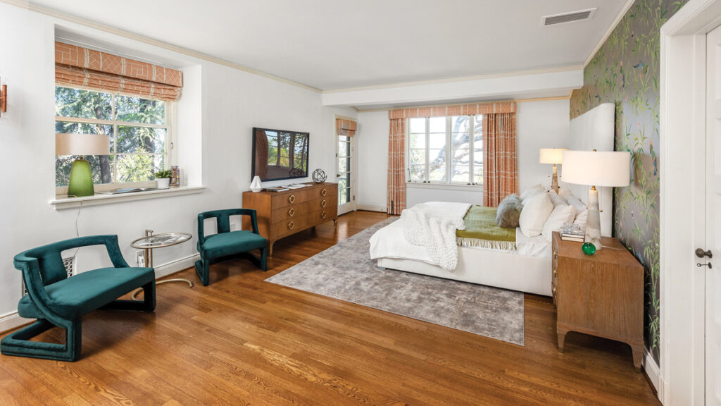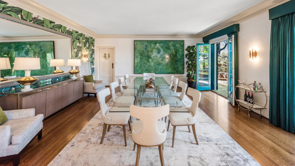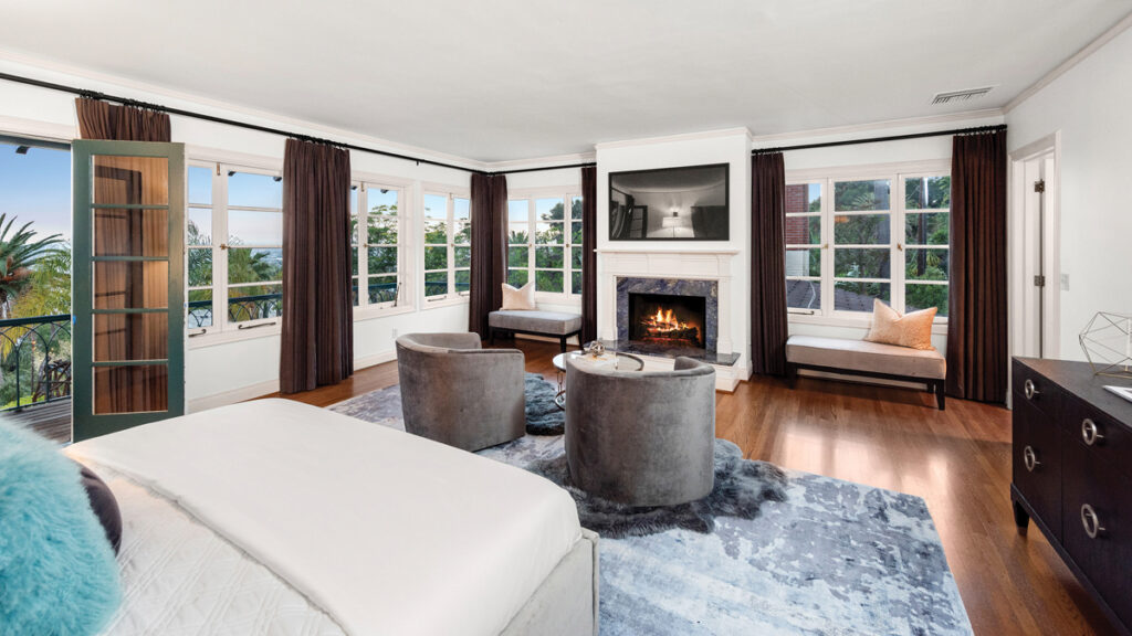Spațiul locuibil este la fel de generos, măsurând 950 de metri pătrați, împărțiți între clădirea principală cu cinci dormitoare, casa de oaspeți cu trei camere și apartamentul de deasupra garajului care poate adăposti cinci mașini.