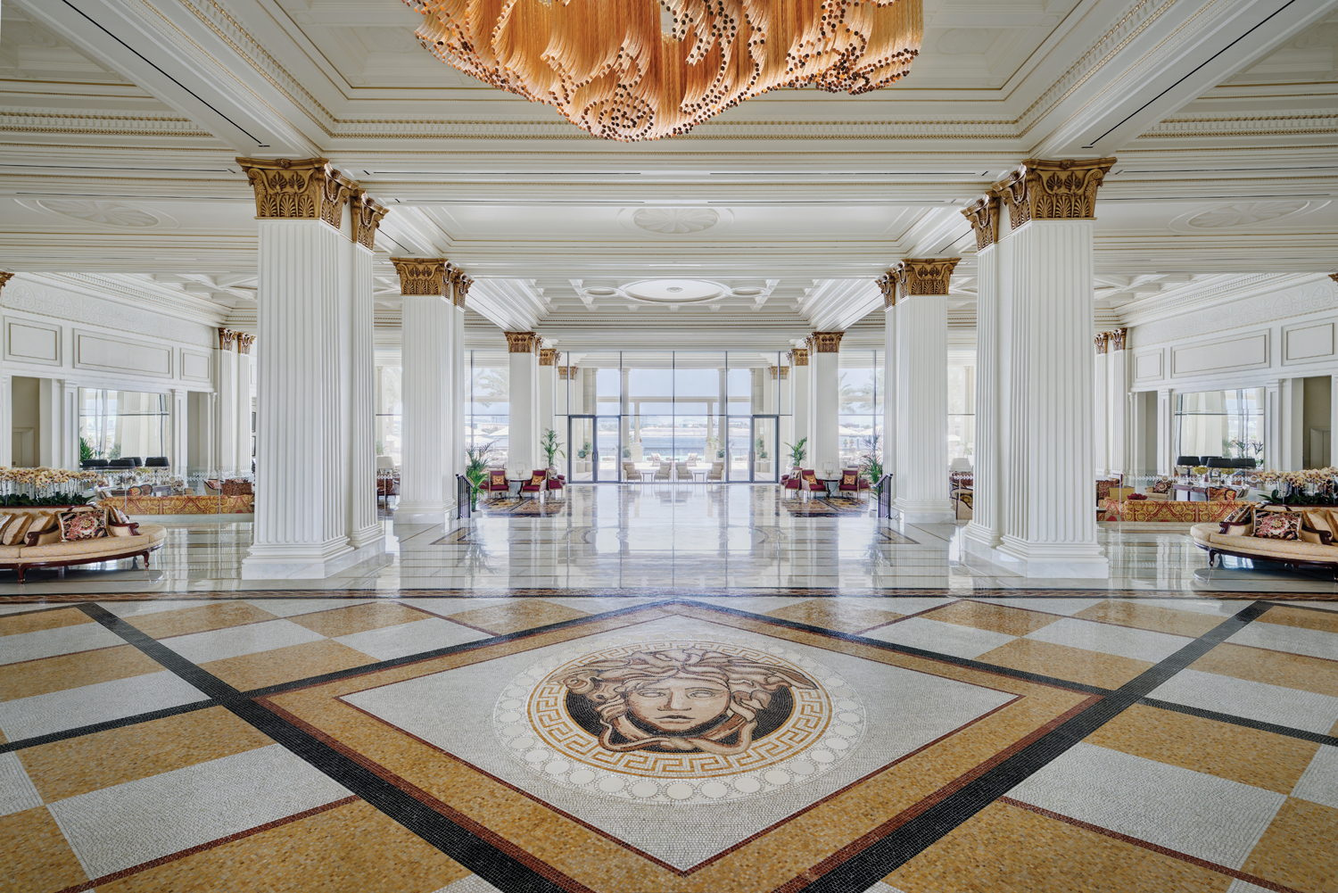 Simbolul Casei Versace, capul Medusei, lucrat în piatră de râu, te întâmpină pe podeaua holului, chiar sub candelabrul care cântărește nu mai puțin de trei tone. Spațiile comune ale hotelului sunt lucrate în marmură, există un mozaic ce conține nu mai puțin de 1,5 milioane de piese, coloane de marmură cu extremitățile superioare aurite, picturi murale. Piesele de mobilier sunt furnizate de Casa Versace, iar unele dintre materiale sunt folosite exclusiv pentru această locație.