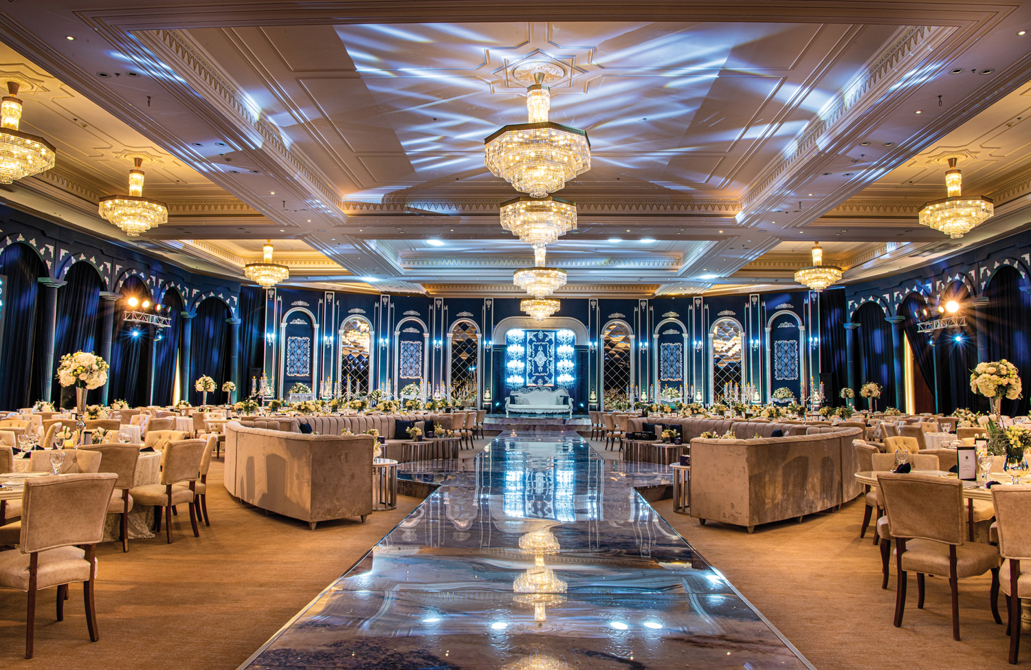 Locul care impresionează cel mai mult este holul hotelului, un atriu de 38 de metri înălțime (o treime din înălțimea Turnului Eiffel din Paris, ceva mai mult decât un bloc cu zece etaje din București). Pereții sunt lucrați în filigran, iar din tavan atârnă candelabre impresionante.