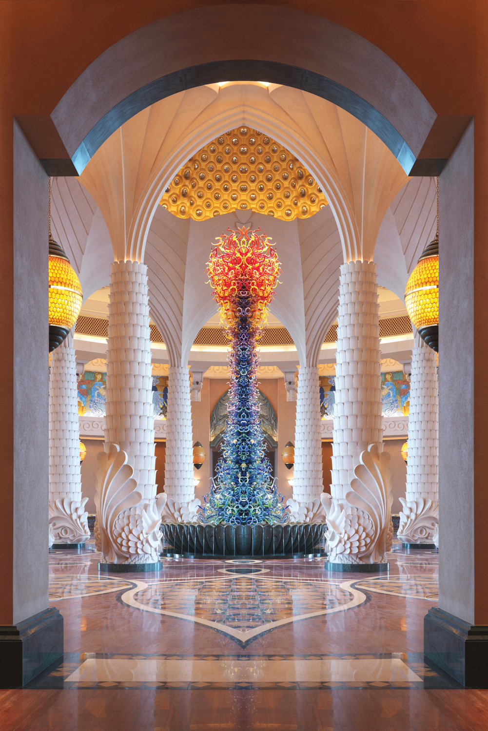 Atlantis a fost primul resort inaugurat pe insula artificială The Palm, din Dubai. Hotelul are 1.548 de camere și 22 de etaje și a costat 1,5 miliarde de dolari. În hol sau the Grand Lobby, o sculptură în sticlă de Dale Chihuly impresionează prin colorit și dimensiune.