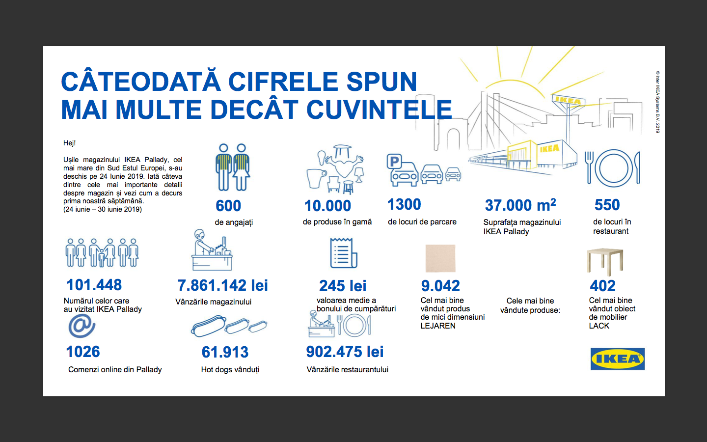 ”În prima săptămână de la deschidere, magazinul IKEA Pallady a înregistrat vânzări de 7.861.142 lei. Peste 100.000 de oameni au vizitat magazinul în perioada 24 iunie – 30 iunie 2019 (inclusiv), valoarea medie a bonului de cumpărături fiind de 245 de lei”, se arată în comunicat.