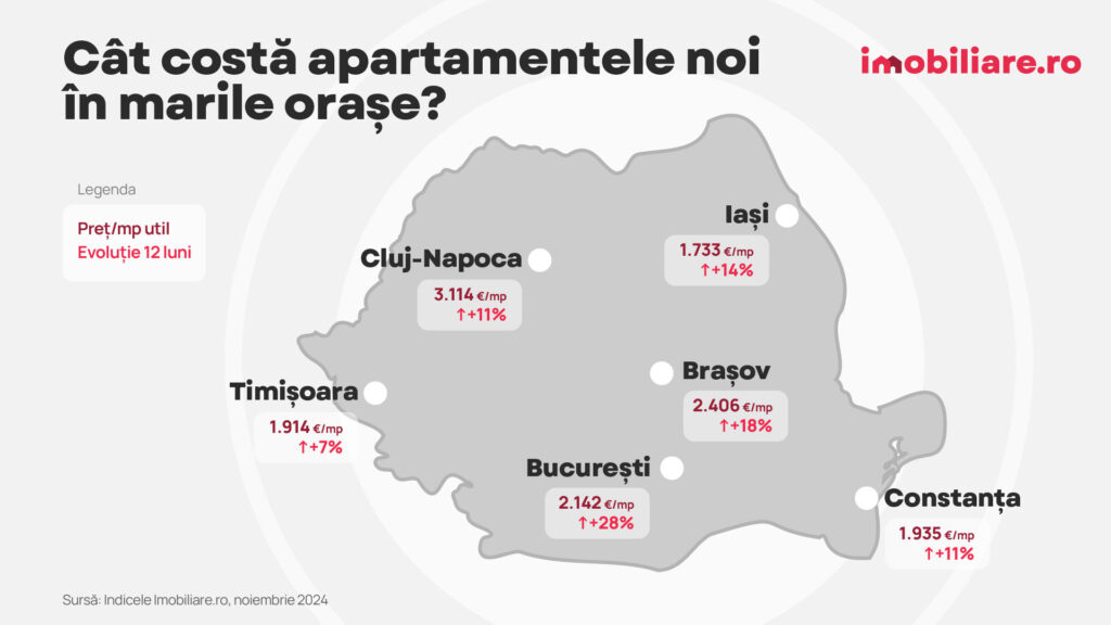 În schimb, în alte orașe mari au fost creșteri și mai accentuate. Cel mai mult s-au scumpit, pe segmentul nou al pieței imobiliare, apartamentele din București: un avans cu 28% într-un an, până la o medie de 2.142 euro/mp util.