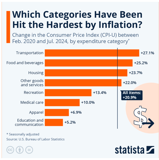 Alte categorii de cheltuieli cu creșteri de prețuri peste medie de la începutul pandemiei sunt alimentele și băuturile, precum și locuințele, care au crescut cu 26% și, respectiv, 24,9% din februarie 2020. Prețurile pentru recreere, îmbrăcăminte și îngrijire medicală au înregistrat creșteri mai moderate în ultimii patru ani și jumătate. Prețurile energiei nu sunt o categorie separată, ci sunt incluse în alte categorii în funcție de scopul lor. De exemplu, prețurile benzinei sunt incluse în categoria transport, în timp ce energia pentru gospodărie este inclusă la locuințe. Privit separat, prețul energiei a înregistrat 27% creștere din februarie 2020.