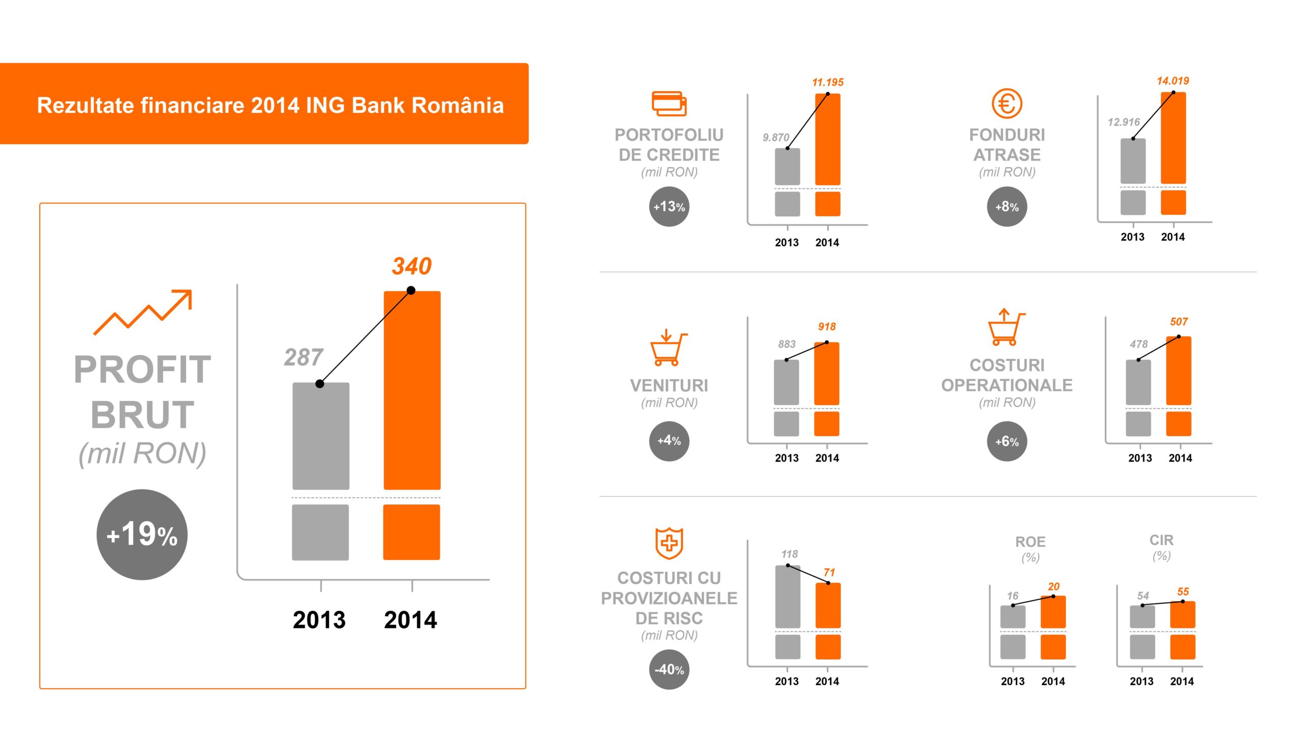 ING Bank România a înregistrat în 2014 un profit brut de 340 milioane de RON, în creștere cu 19% față de anul anterior. Rezultatul vine ca urmare a creşterii veniturilor şi scăderii costurilor cu provizioanele de risc, cu 40% mai mici faţă de 2013, potrivit băncii.