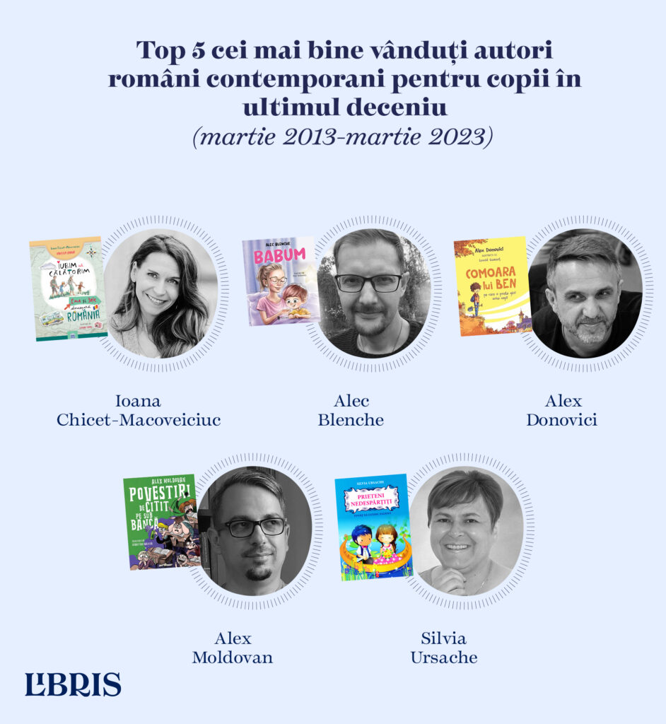 Topul celor mai bine vânduți autori români pentru copii este condus, atât în ultimii 10 ani, cât în ultimul an, de Ioana Chicet-Macoveiciuc. Alec Blenche și Alex Donovici completează topul celor mai bine vânduți autori români contemporani în ultimii 10 ani.
