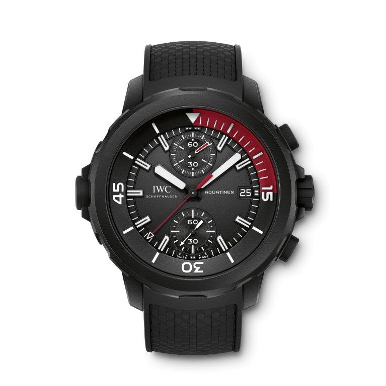 IWC propune o paletă tricoloră familiară pentru noua sa linie Aquatimer. Linia se deschide cu Chronograph „La Cumbre Vulcano“, un model dominat de cadranul cu accente vișinii, dedicat unui vulcan cu același nume de pe insula Fernandina, arhipelagul Galapagos. Cu un bezel dublu (intern / extern), folosit de scafandrii pentru calcularea timpilor de scufundare, ceasul e pus în funcțiune de un mecanism automatic cu funcție de cronograf și dată. Carcasa masivă cu un diametru de 44 de milimetri a fost fabricată din oțel inoxidabil și, alături de coroana cu filet, asigură etanșeitatea modelului până la o presiune de 30 de bari.