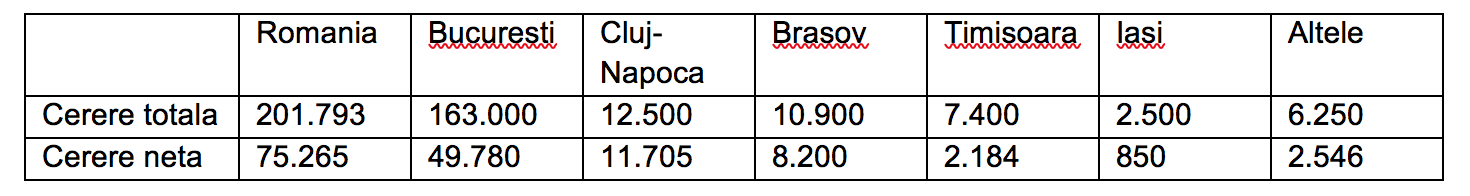 De remarcat însă că raportul dintre cererea totală și cerere netă este diferit în București comparativ cu marile orașe. Astfel, dacă în București din totalul de 163.000 metri pătrați tranzacționați în primele nouă luni, cererea netă a reprezentat 30% din total, în afara Capitalei, din aproape 40.000 metri pătrați cerere totală, 64% reprezintă închirieri de spații noi.