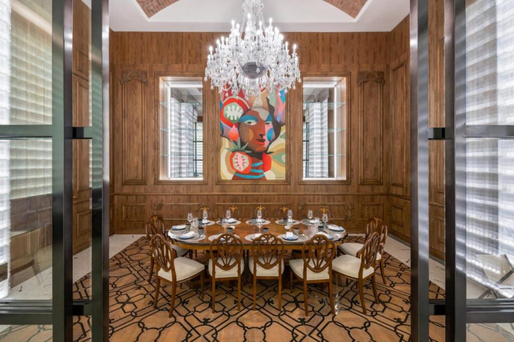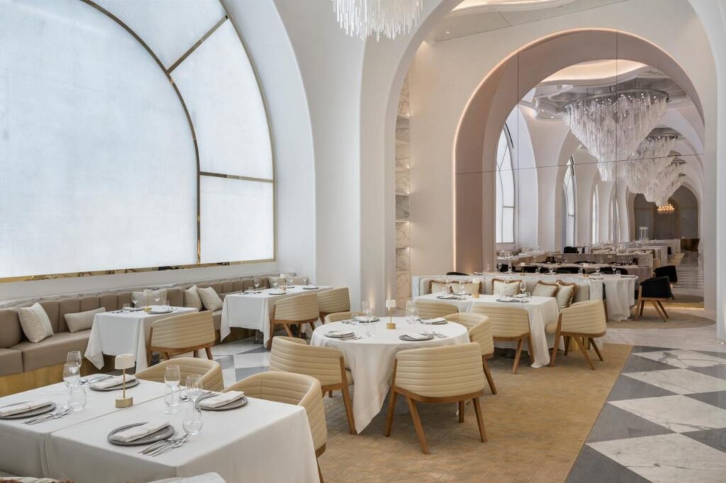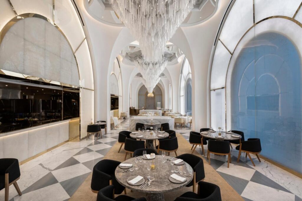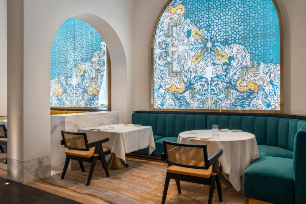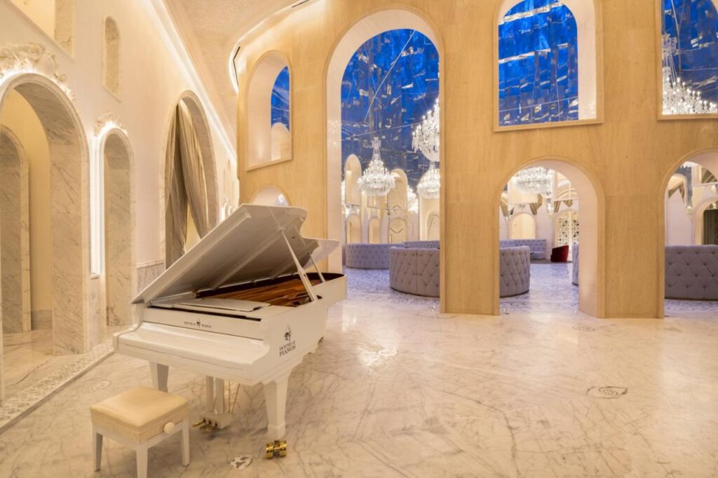 Ambițiosul proiect a avut nevoie de cinci ani pentru a fi finalizat. Aripa din stânga este ocupată de hotelul Raffles, care oferă exclusiv apartamente pentru cazare. Amenajarea interioară este inspirată de arta islamică, arabescurile decorând cu grație și migală, uneori în exces, aproape orice suprafață, de la arcele tavanelor, specifice arhitecturii orientale, până la pereți, podele și ușile sau separeurile de sticlă.