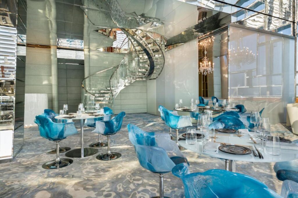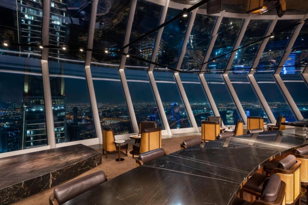 Punctul de atracție al lobby-ului este pianul alb pe care se reflectă lumina care coboară din tavanul unui atrium de 60 de metri înălțime. La barul de pe acoperiș, Acoustic, oaspeții pot asculta muzică live și admira excepționala panoramă nocturnă a orașului. Cel mai spectaculos apartament al hotelului este duplexul Raffles Suite, care are propria piscină, lift, hammam și salon de coafură.