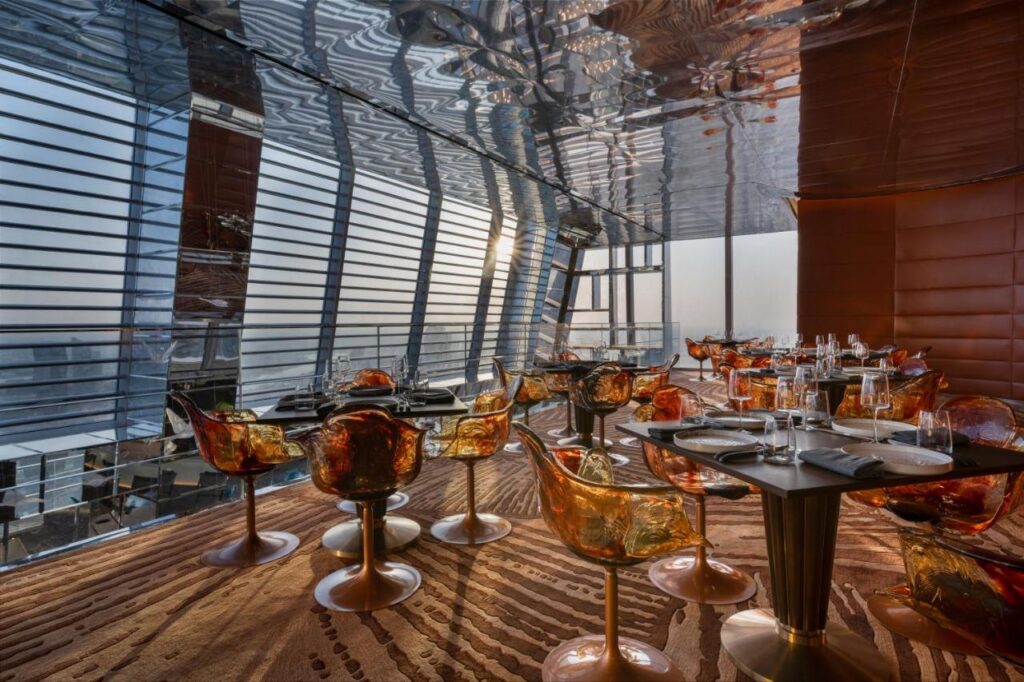 Aripa Fairmont vizează tot călătorii obișnuiți cu luxul, dar pe cei mai dinamici, mai activi, designul interior și paleta de culori fiind inspirate de yachting. În lobby, textura pereților este realizată din pătrate de aur de 18k, iar din tavanul înalt de 56 de metri, cel mai mare candelabru din lume își împrăștie cu generozitate în jur razele aurii.