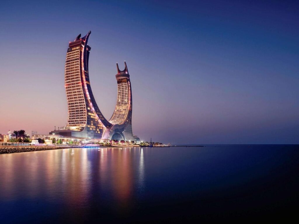 Situată în Golful Persic, în orașul Lusail, clădirea Katara Towers reproduce stema națională a emiratului Qatar, două iatagane încrucișate, și adăpostește, pe o suprafață de 300.000 de metri pătrați, două hoteluri, Fairmont și Raffles, manageriate de rețeaua Accor.