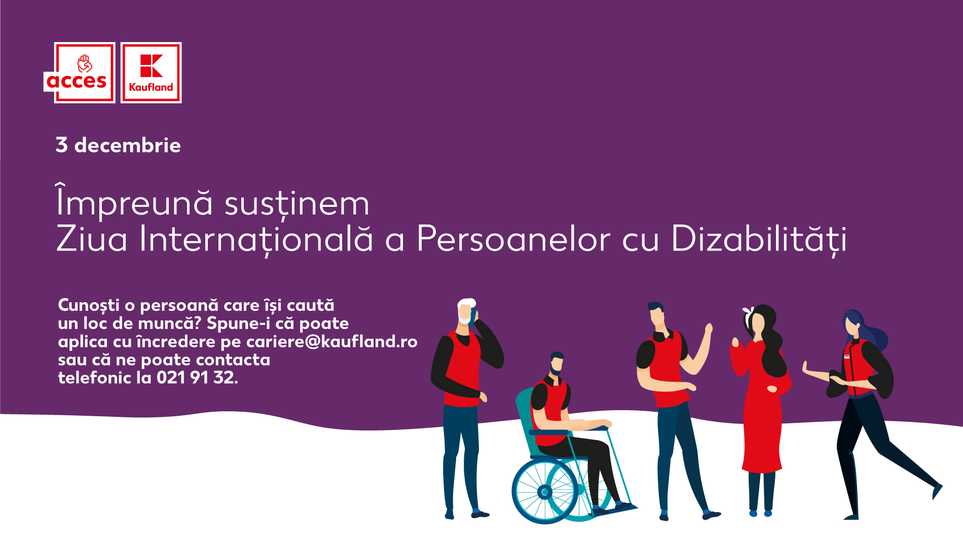 Cu ocazia Zilei Internaționale a Persoanelor cu Dizabilități, Kaufland se alătură inițiativei lansate de Camera de Comerț a Diversității din România, alături de alte companii și organizații, în semn de solidaritate pentru persoanele cu dizabilități. Astfel, Sediul Central Kaufland din București va fi iluminat în culoarea violet în cursul zilei de astăzi, începând cu ora 18:00 și până la miezul nopții. Compania răspunde prompt acestei acțiuni, din dorința de a transmite, și cu acest prilej, un mesaj puternic și încurajator către persoanele cu dizabilități – oricine își poate găsi locul în echipa Kaufland, indiferent de ceea ce îl face diferit.