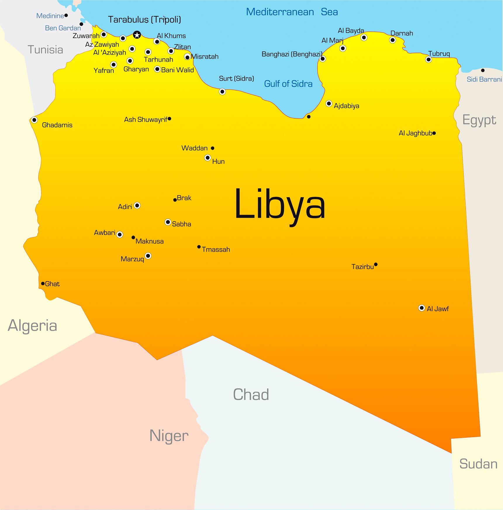 Frontierele terestre cu Algeria, Egipt, Ciad şi Niger sunt închise; singura frontieră terestră care funcţionează cu intermitenţe este cea cu Tunisia.