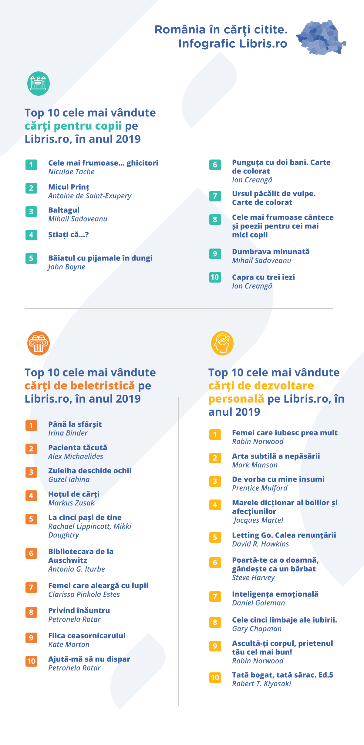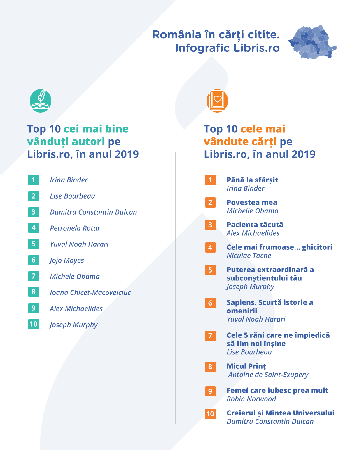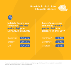 Județele în care se comandă cele mai multe cărți, raportat la numărul de locuitori, sunt București, Cluj, Brașov (creștere de 107%), Sibiu, Timiș (unde s-au înregistrat cu 61% mai multe comenzi decât în 2018) și Iași.