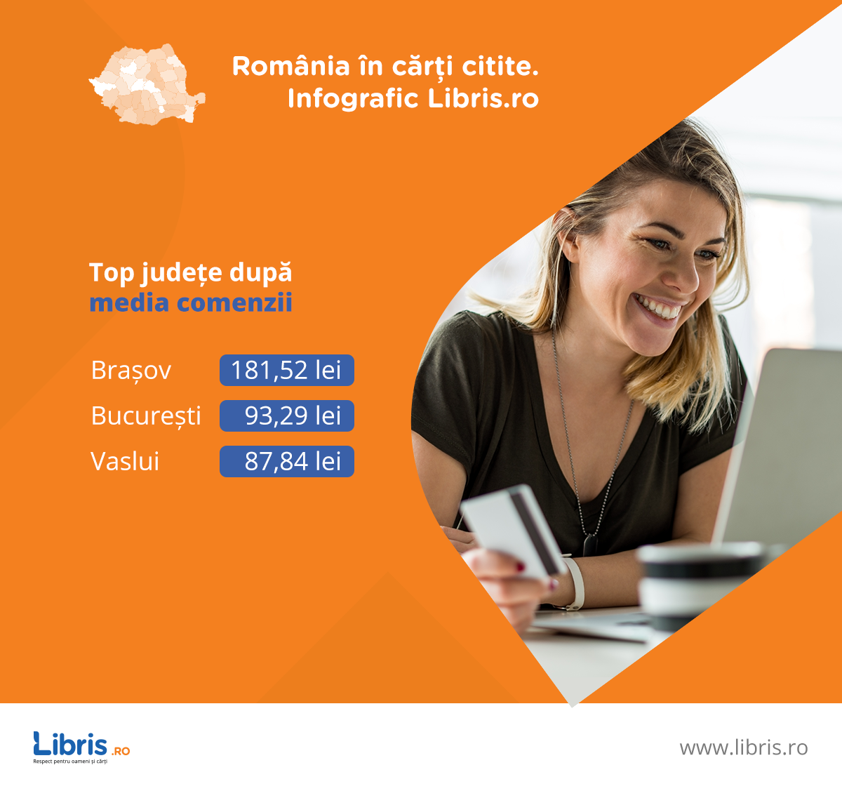 Astfel, cel mai activ client din Capitală a făcut 125 de comenzi pe Libris.ro în 2019. Cea mai mare medie a comenzii este însă înregistrată în Brașov (181 lei), iar cea mai mică în Giurgiu (70 lei), în timp ce Capitala se află pe locul doi în clasament, cu o medie de 93 lei/comandă.