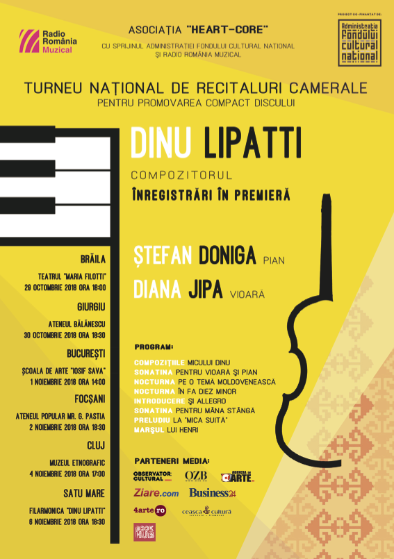 Turneul de promovare a CD-ului ,,Dinu Lipatti – compozitorul, înregistrări în premieră” este organizat de Asociația ,,Heart-Core”, co-finanțat de Administrația Fondului Cultural Național cu sprijinul Radio România Muzical.