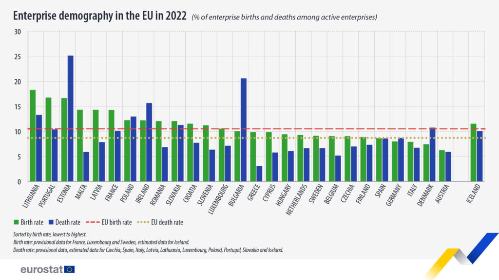 Cele mai mari rate de înființare de noi companii au fost înregistrate în Lituania (18,3%), Portugalia (16,7%) și Estonia (16,6%). În schimb, cele mai scăzute rate au fost înregistrate în Austria (6,2%), Danemarca (7,4%) și Italia (7,9%).