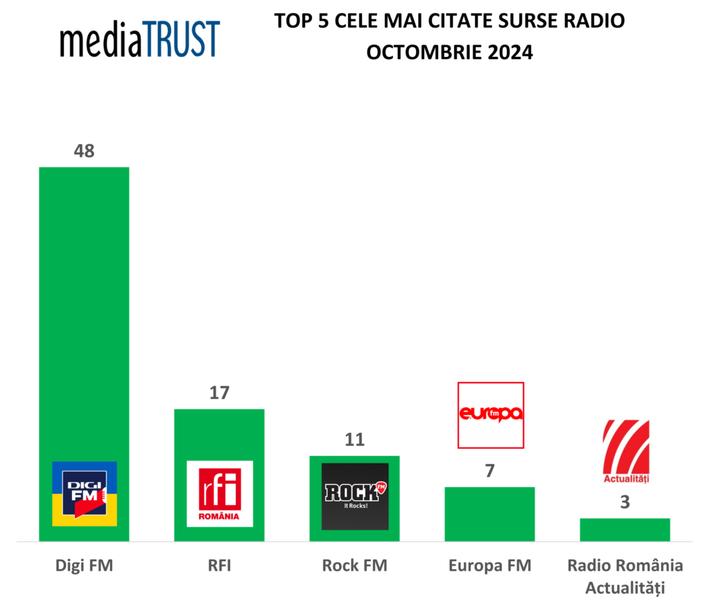 RFI se poziționează pe locul al doilea cu 17 citări. Rock FM închide podiumul cu 11 citări, urmat de Europa FM cu 7 citărişi Radio România Actualităţi cu 3 citări.
