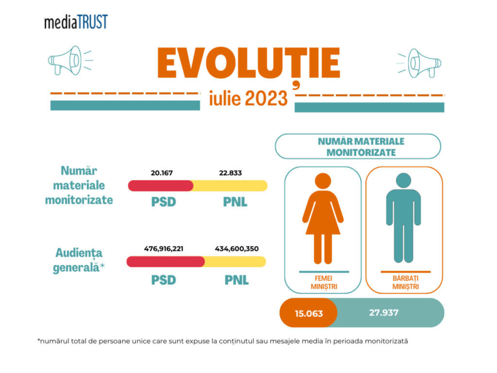 În perioada monitorizată de mediaTRUST, 1-31 iulie 2023, miniștrii PNL au înregistrat cel mai mare număr de materiale la TV, radio, presa scrisă, presa online și social media. Au fost menționați în 22.833 de materiale jurnalistice, ceea ce se traduce prin faptul că audiența însumată a informațiilor despre aceștia a ajuns la români de peste 25 de ori într-o lună (434.600.350 de contacte).
