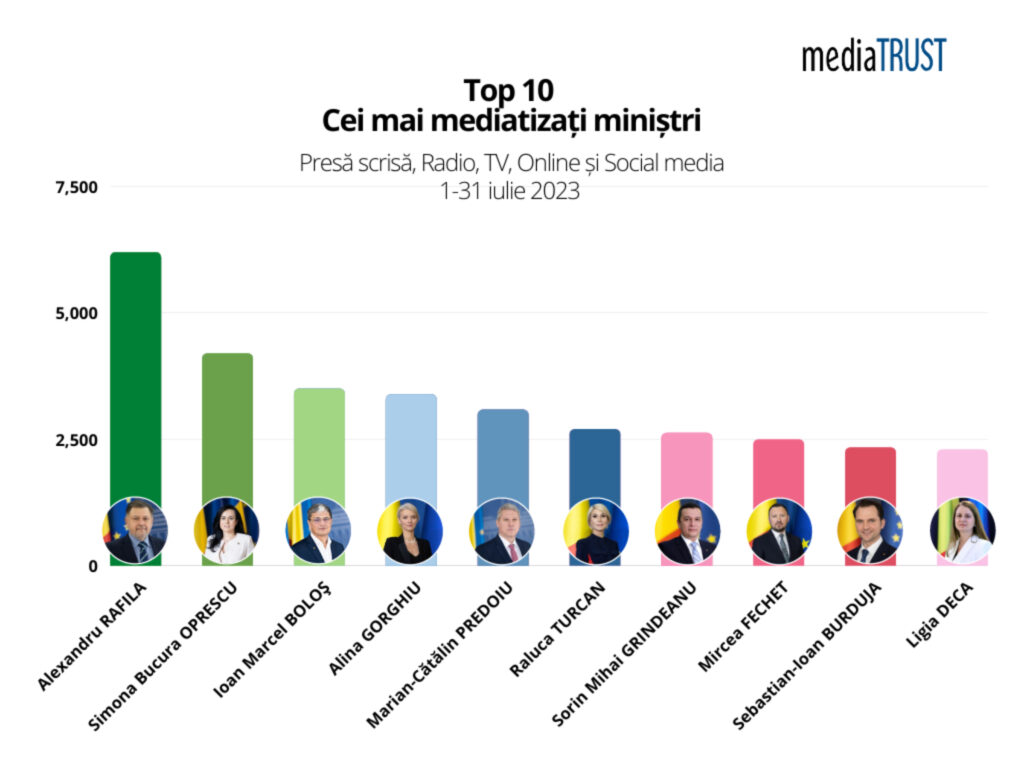 Alexandru RAFILA – Cel mai mediatizat ministru în iulie. Simona BUCURA-OPRESCU pe poziția a doua, iar Marcel-Ioan BOLOȘ închide podiumul.