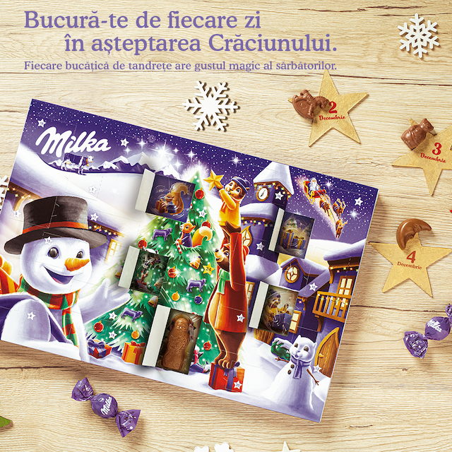 Anul acesta, mai mult ca oricând, Milka propune un Crăciun tandru, invitându-ne pe fiecare dintre noi să ne bucurăm de cât mai multe clipe frumoase, alături de cei dragi, și de un răsfăț dulce din propriul nostru Calendar Advent Milka, cu 24 de bucățele de ciocolată fină, cu lapte alpin. Pe site-ul www.cadouritandre.ro, Milka oferă mici îndemnuri pentru a ne pregăti pentru o lună decembrie de neuitat: să îi trimitem scrisori lui Moș Crăciun, să împodobim bradul și casa, să trimitem felicitări de Crăciun, să pregătim cadourile și să coacem prăjituri.