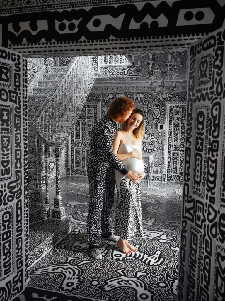 Lucrările lui Sam Cox, acum în vârstă de 28 de ani, sunt de obicei alb-negru și de dimensiuni variabile, cea mai amplă dintre acestea fiind… o casă – propria locuință pe care artistul a desenat-o integral cu celebrele-i forme. I-a luat doi ani s-o decoreze, atât pe interior, cât și pe exterior, și nu s-a rezumat doar la ziduri, mobilier sau electrocasnice; desenele sale nebunești împodobesc și hainele doamnei Cox, alături de care artistul se pregătește să devină tată.