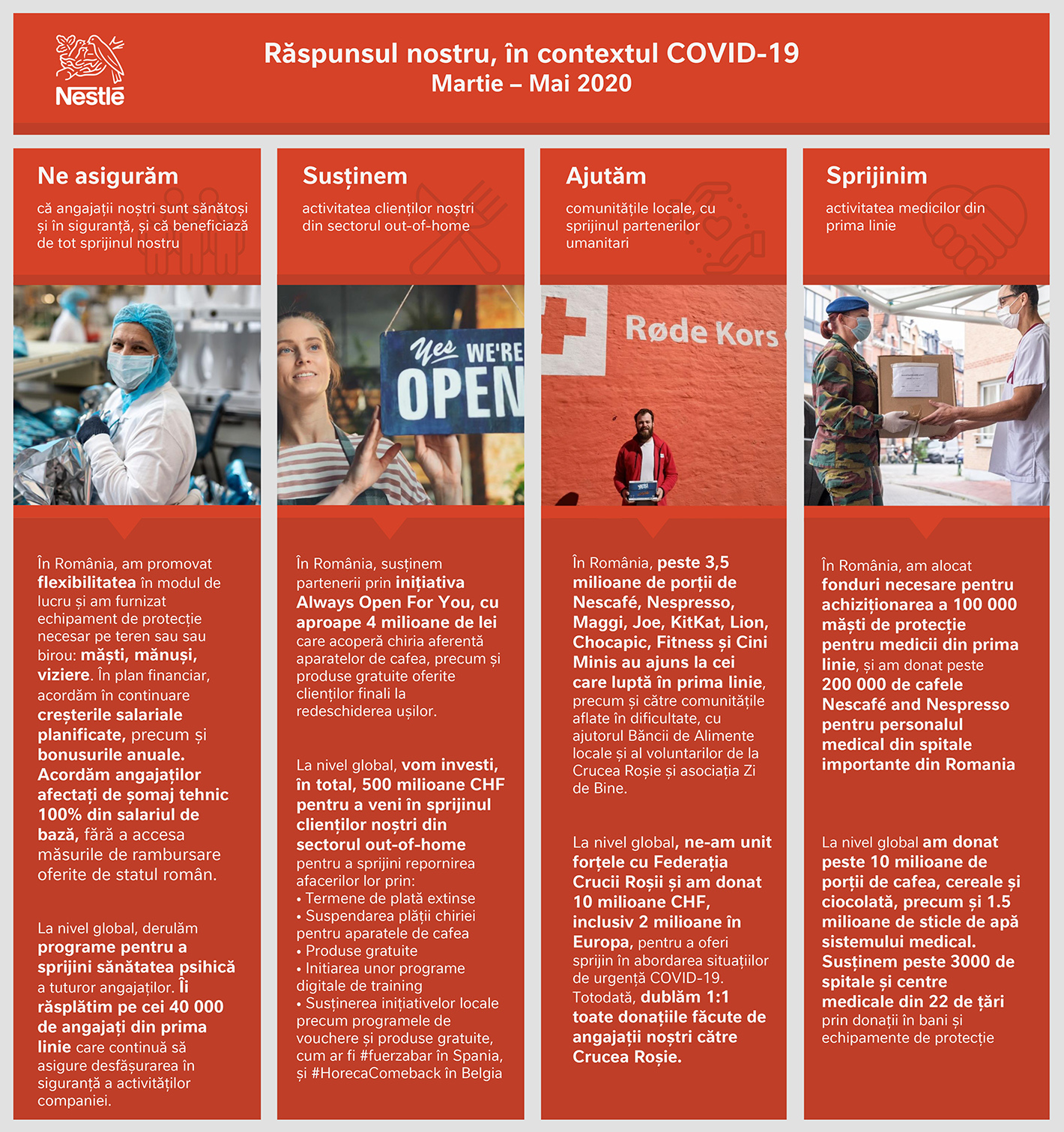 În perioada următoare, compania Nestlé va susține reluarea activității partenerilor de afaceri din domeniile afectate, prin oferirea de produse în mod gratuit și alocarea unor fonduri speciale, oferind totodată sprijin suplimentar angajaților pentru a le asigura sănătatea, siguranța și bunăstarea. O atenție deosebită este acordată partenerilor din sectorul out-of-home, sever afectat la nivel național. Divizia out-of-home a înregistrat o scădere de două cifre în primul trimestru din 2020, generată de măsurile din zona HORECA și de impactul semnificativ asupra consumului în afara casei: „În ciuda dificultăților întâmpinate în această categorie, este prioritar pentru noi să fim alături de partenerii noștri pentru a-i sprijini în repornirea afacerilor, odată cu relaxarea măsurilor. Ca parte a inițiativei Always Open For You, am reușit să le oferim acestora capital adițional de aproape 4 milioane de lei prin care își pot asigura continuitatea business-urilor în această perioadă critică.”, a declarat Ovidiu Tunaru, Business Executive Officer Nestlé Professional.