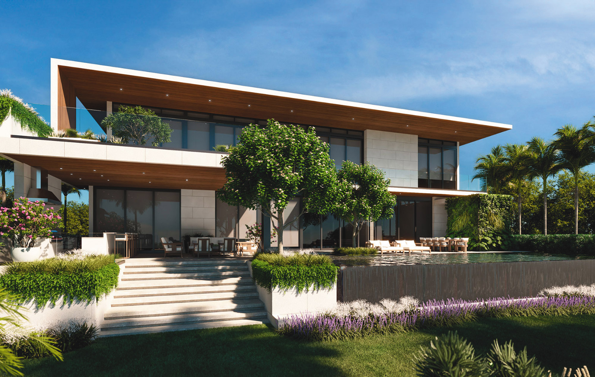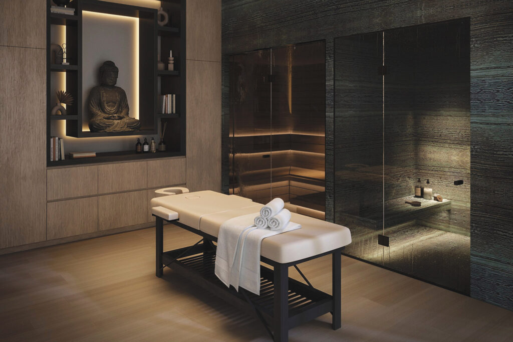 Imobilul este dotat cu un cinematograf, o sală de gimnastică și un centru spa și o terasă pe acoperiș care oferă vederi panoramice ale golfului și ale orizontului orașului. Proprietatea mai are o piscină lungă cu margine infinity, o terasă îmbrăcată în marmură și o zonă de divertisment acoperită în aer liber, cu bucătărie exterioară.