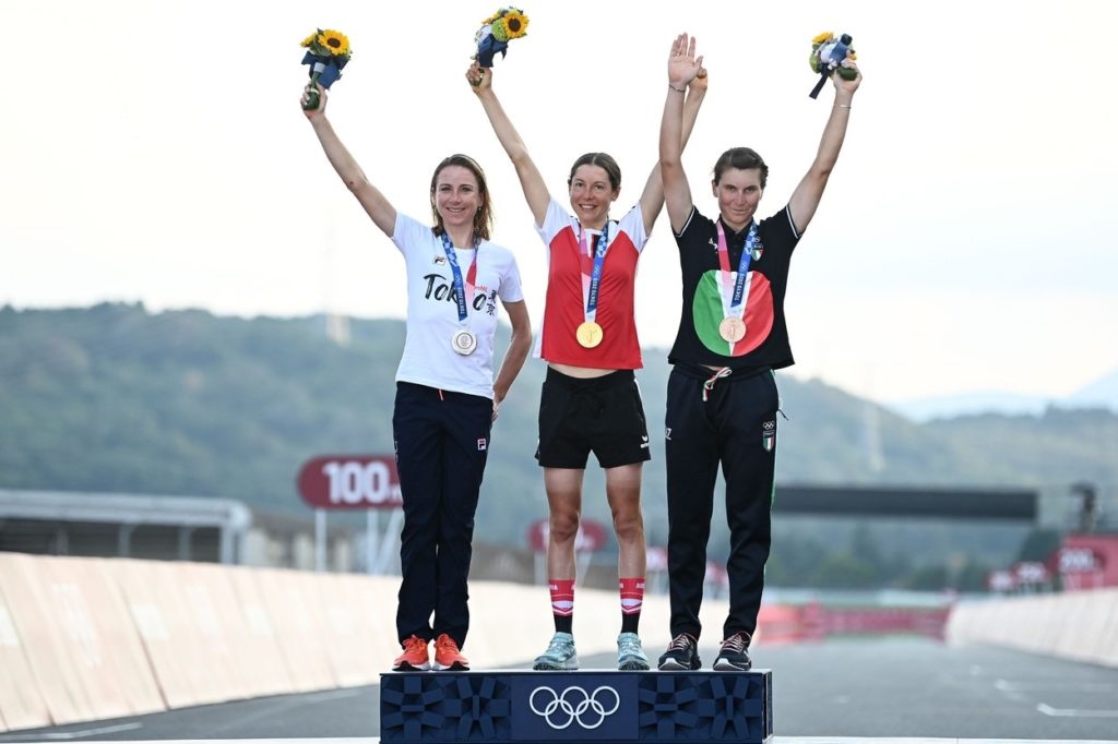 Podiumul competiției feminine de ciclism de la Jocurile Olimpice de la Tokyo: Anna Kiesenhofer (Aur, Austria), Annemiek van Vleuten (Argint, Olanda) și Elisa Longo Borghini (Bronz, Italia)