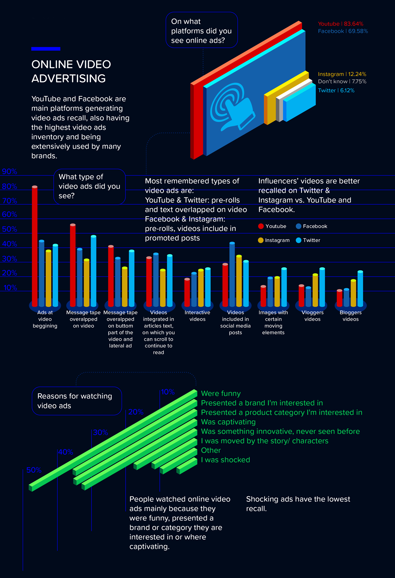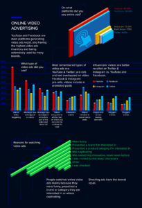 YouTube (84%) și Facebook (70%) sunt principalele platforme menționate de respondenți, unde aceștia își amintesc de reclamele video.