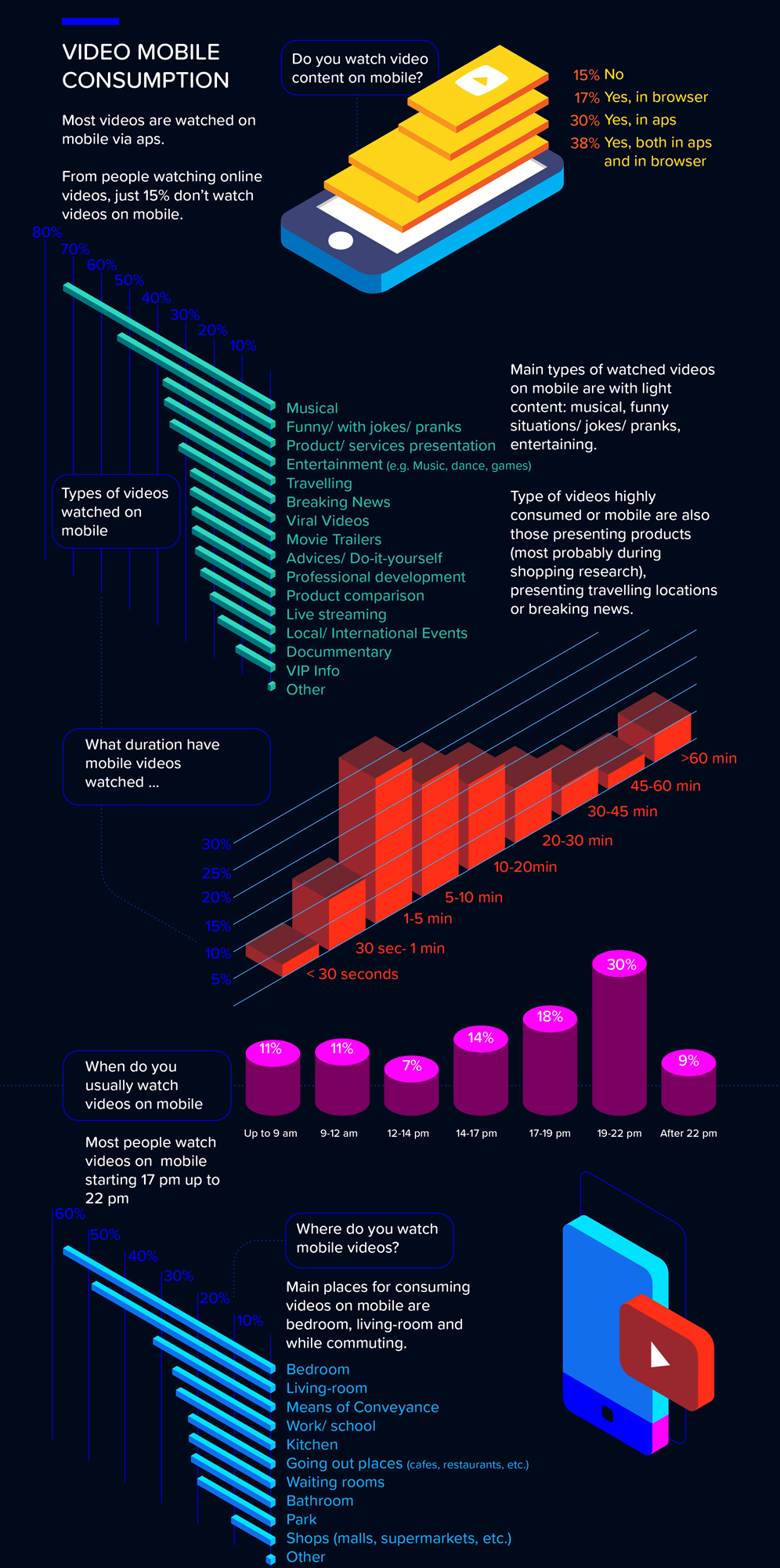 Cei mai mulți români urmăresc clipuri video de 5-10 minute pe mobil, iar orele din zi în care consumă cel mai mult conținut video sunt între 17:00 și 22:00. Locurile preferate de unde românii se relaxează vizionând conținut video sunt dormitorul de acasă (58%) și camera de zi (50%), iar o treime vizionează și din mijloacele de transport (33%).