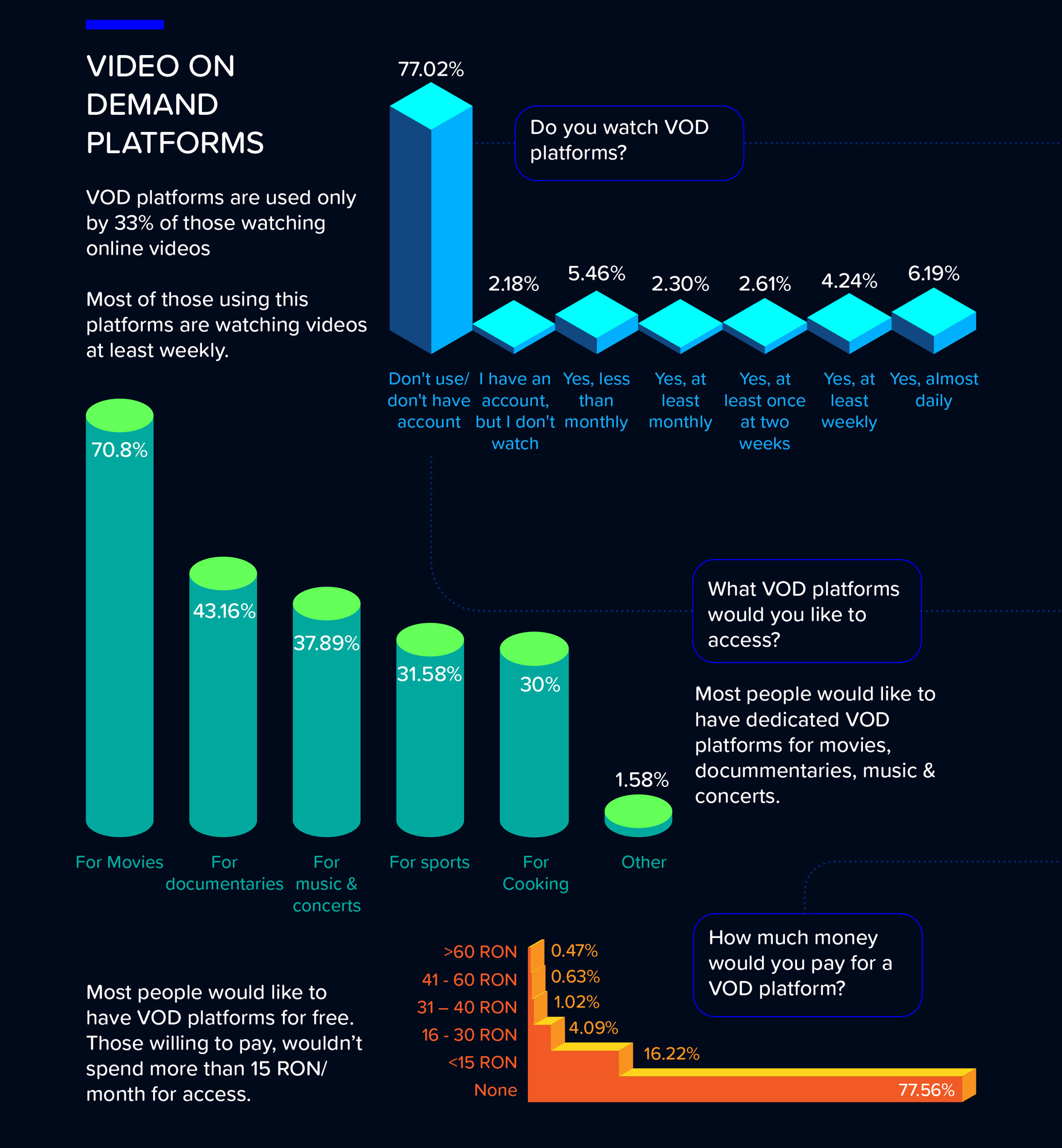 Platformele de tipul Video on Demand (sisteme sau platforme care permit utilizatorilor să vizioneze conținut video și audio când doresc, contra unui abonament lunar) sunt utilizate doar de o treime din cei care urmăresc clipuri video online. Dintre aceștia, cei mai mulți le accesează cel puțin o dată pe săptămână.