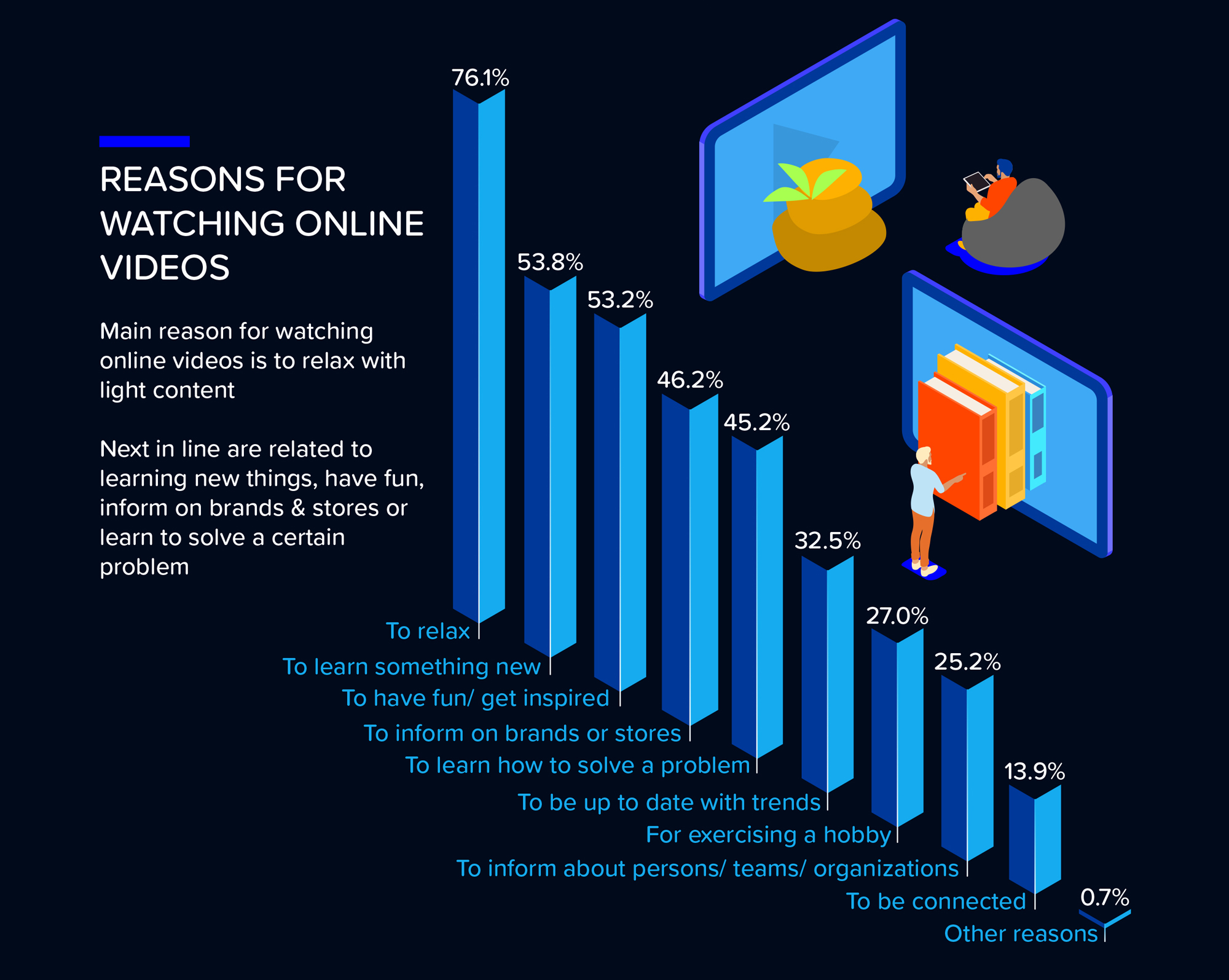 Circa 8 din 10 români vizionează video-uri online pentru relaxare. Dintre aceștia, mai mult de jumătate din nevoia de a învăța ceva nou și pentru inspirație.
