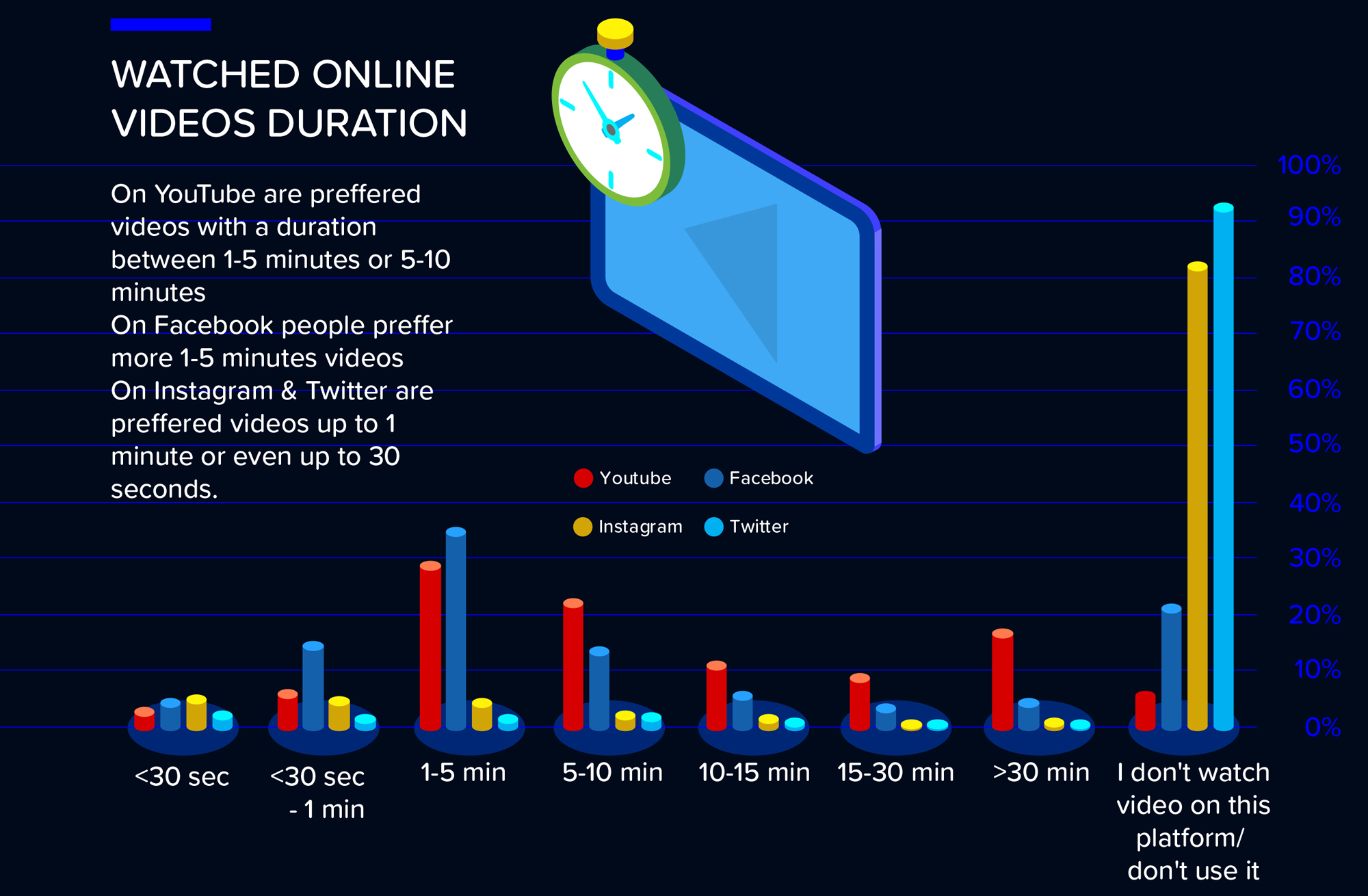 Pe Facebook, sunt preferate video-urile între 1-5 minute, în timp ce pe Instagram și Twitter, cele de până într-un minut.