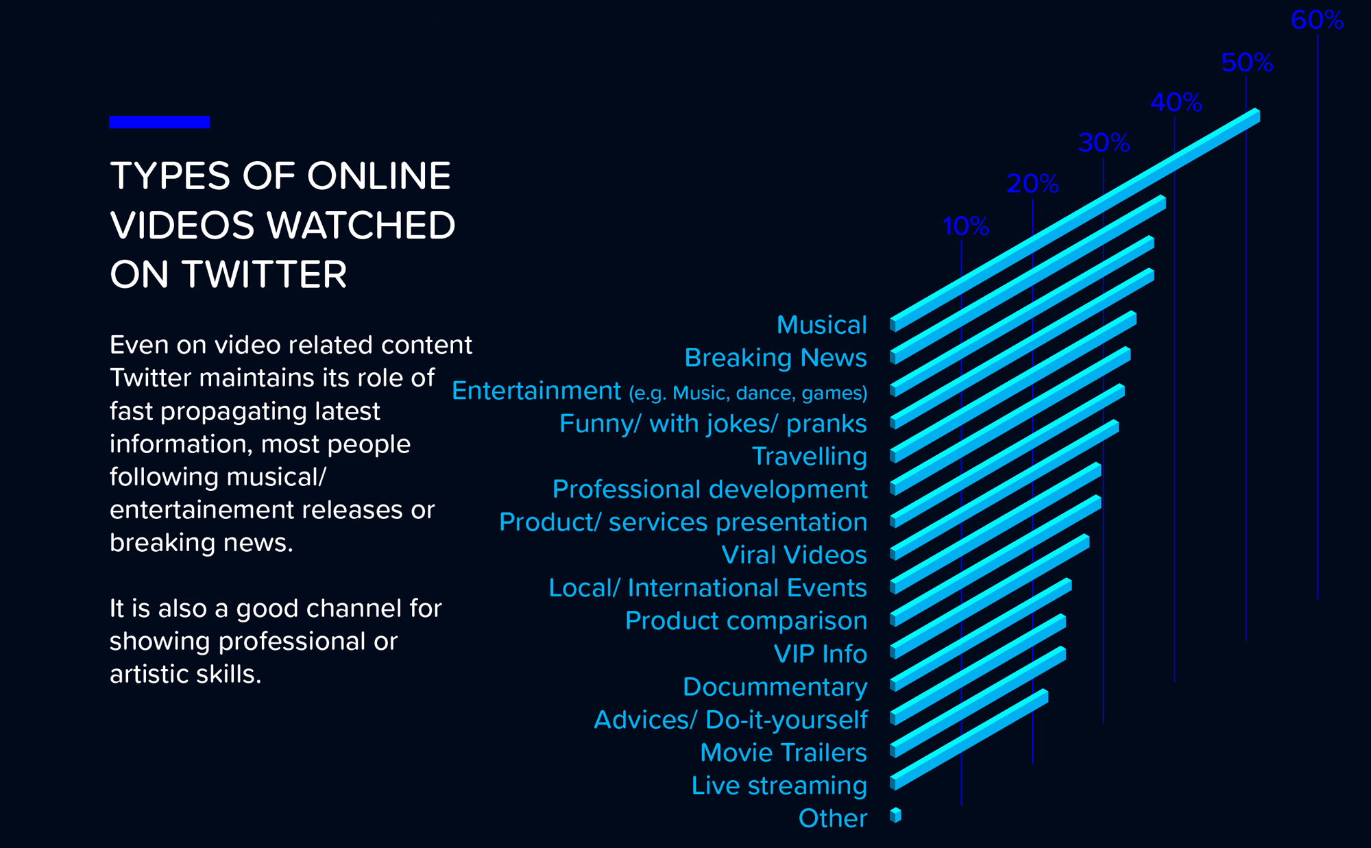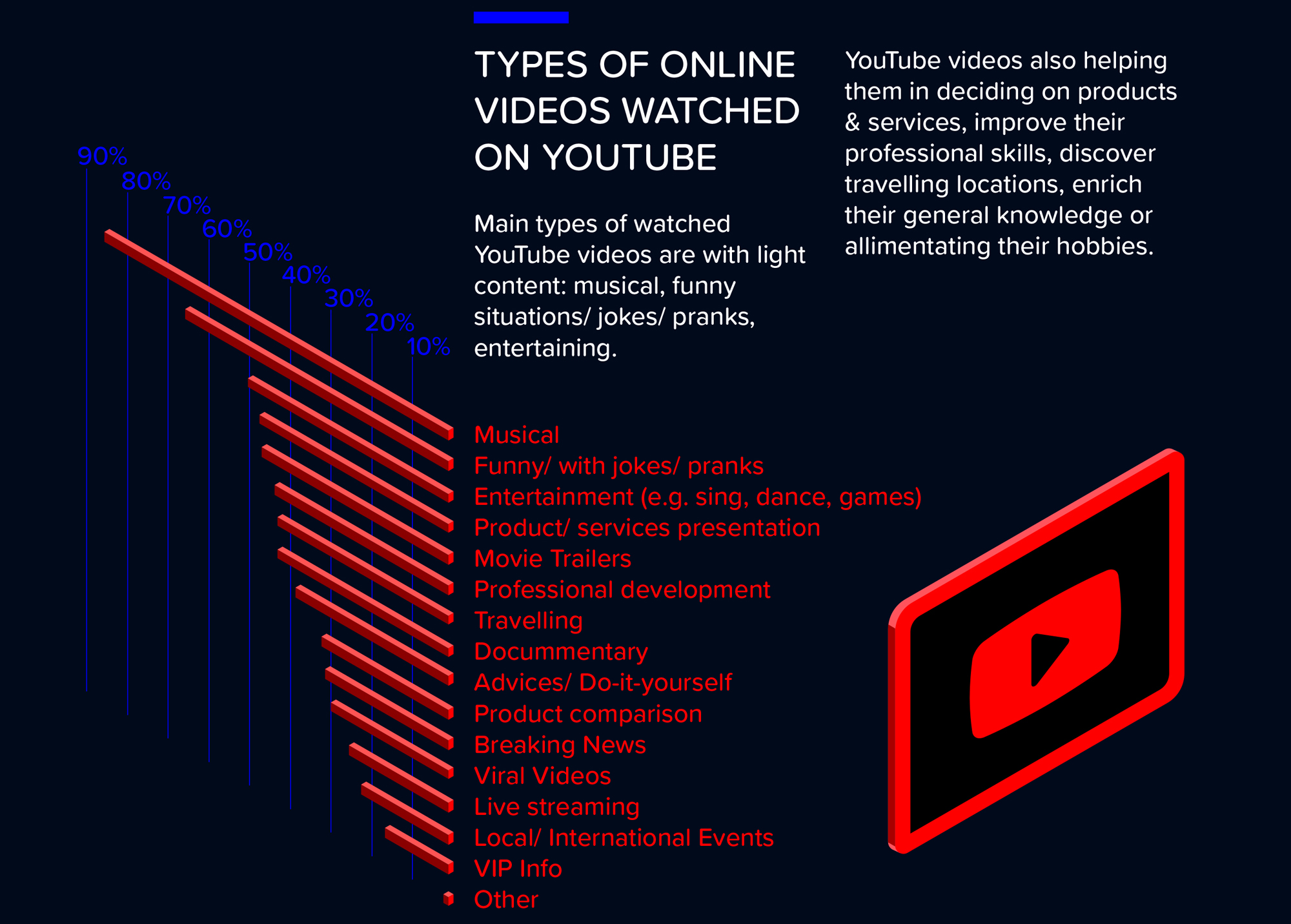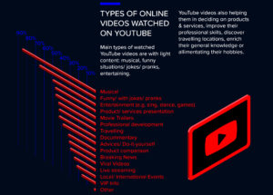 Principalele tipuri de conținut video online vizionat pe YouTube sunt videoclipurile muzicale (85%), amuzante (65%) și de divertisment (muzică, dans, jocuri – 50%).