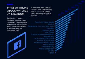 Același conținut de relaxare și divertisment se regăsește și pe Facebook atunci când vorbim despre cele mai urmărite videoclipuri – amuzante (69%), muzicale (57%) și de divertisment (46%). Conținutul video de pe Facebook reprezintă, deopotrivă, o sursă de informare în ceea ce privește călătoriile sau vacanțele, știri de ultimă oră, având o capacitate foarte mare de a răspândi informația rapid.